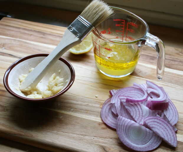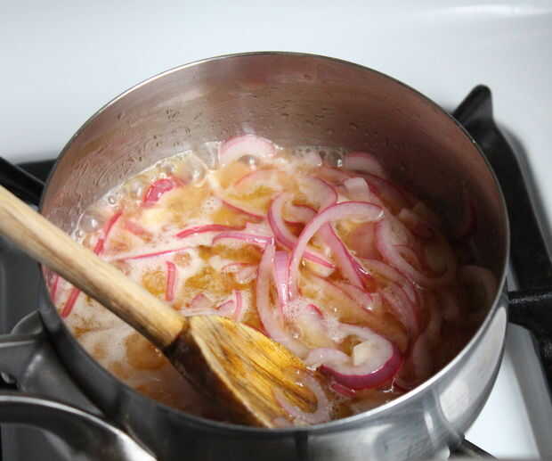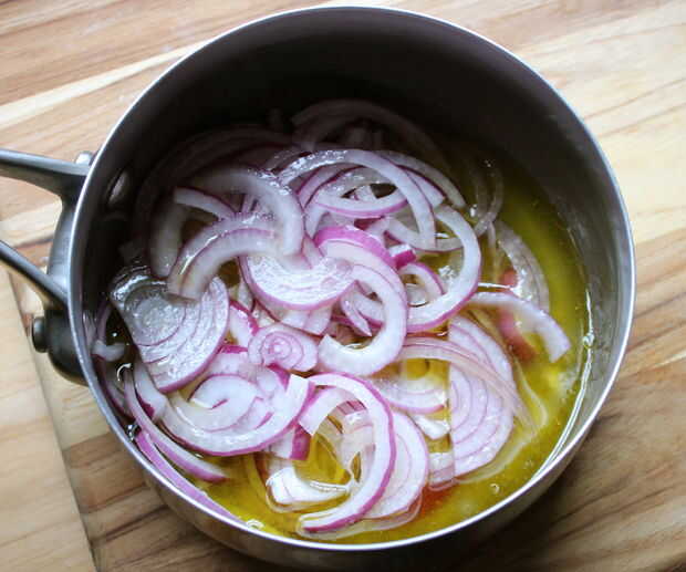Cortar la cebolla roja bonita y delgada y chop/puré sus dientes de ajo junto con 1/2 cucharadita de sal. Combinar en una cacerola pequeña con el jugo de limón y aceite de oliva.