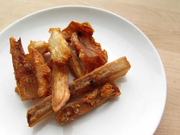 Yuca es una raíz feculenta que fries para arriba maravillosamente.