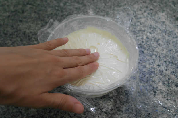 Paso 7: Tomar un trozo de film transparente y poner sobre la crema de hielo para crear una superficie lisa y luego volver a la nevera para pasar la noche