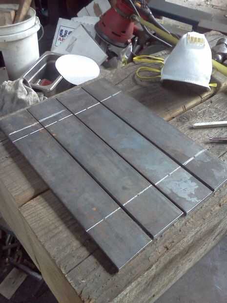 6. cambio de marchas, cortar cuatro piezas adicionales del 1/4 "x 2" y soldadas en una configuración de "T". Éstos se convirtieron en los soportes de montaje para el yunque, sí mismo.