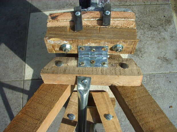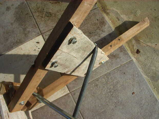 Para evitar las patas se muevan una con respecto a otra, dos de las uní a dos con trozos trapezoidales de madera, cada uno asegurado con cuatro bulones. Una vez armado el conjunto, corté dos trozos de caño de hierro delgado, les aplasté los extremos, les hice agujeros y los atornillé sujetando el punto medio de cada par de patas con el tronco del par opuesto. El desplegado para trasladar la mesa se hará retirando los cuatro tornillos para madera sujetan los dos trozos de caño.