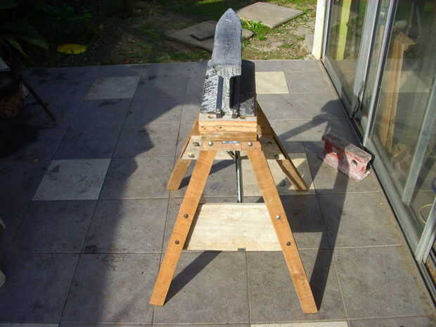 El yunque Hace un tiempo estaba tratando de conseguir un yunque un poco mejor que el pequeño pedazo de riel que he estado usando hasta ahora. Hice algunas investigaciones y una conocida me vendio un pedazo de riel cerca de 70 cm de largo en 36 $USD, mucho más grueso y más pesado que tuve. Estaba en muy mal estado, posiblemente parcialmente enterrada o bajo el agua durante años, porque tenía que llegar con cincel el óxido sobrepuesto, que saltó en escamas de tamaño medio. Luego llevó a una tienda de metal para cortar en mi diseño, previamente marcado con la amoladora. Yo podría no cortar por mí mismo porque el riel de acero es muy duro, y mi molino no puede hacer un trabajo tan pesado. Corta con soplete de acetileno, que es mucho más potente, por $ 24 USD. Una vez cortado, experimentó una intensa sesión de amoladora de mano (tres horas) para eliminar las rebabas de la antorcha, para alisar la superficie superior y también para quitar un poco más moho. Finalmente le di tres capas de líquido Fosfatizante que el moho marrón en un fosfato negro mucho más estable. ¿El apoyo: un tronco o una tabla? Mi primera idea fue utilizar el tradicional: un pedazo de tronco de árbol. Pero después de unos días en la búsqueda de un apropiado, me di cuenta de que las restricciones eran demasiado grandes: cualquiera que sea el medio elegido para el yunque, debe ser: