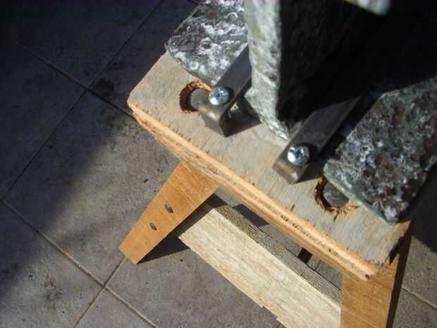 Corté un trozo de tabla de dimensiones modelo mayores la base del yunque. No dado su grosor me satisfizo, apilé dos iguales. Las uní con dos postes, mediante cuatro bulones bien apretados.