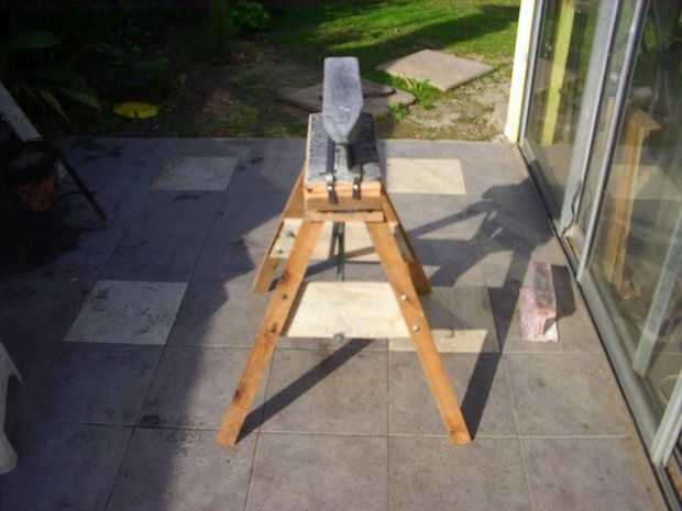 Estos tres puntos son difíciles vienen juntos en un pedazo de tronco, especialmente los dos últimos. Un registro debe tener ambos extremos cortadas perpendicular al eje, por lo que su centro de gravedad esté centrada. Además, excepto que un extremo tiene raíces o ramas, es muy difícil de cumplir el punto 2. Y en ese caso, el punto 3 es más difícil todavía. En fin, decidí que una mesa, hecha de madera semi dura y con la forma adecuada, era preferible a un registro. En la tabla La última vez que los masones estaban haciendo obra en casa, dejó algunas maderas que mantenía al aire libre. Verificó y todavía están en buenas condiciones, así que decidí llevarlos. Había unos cuantos metros de calas y otras maderas. Para hacer el marco tendría que usar tornillos en los puntos de acceso, ya que pegamento apenas resisten el tiempo, y podrían aflojar clavos o tornillos para madera con vibración y esfuerzo de uso. Tuve que comprar tornillos a un ritmo de alrededor de USD 0,25 $ c / u, con tuerca y arandela. Corté un pedazo de tabla con dimensiones ligeramente más grande que la base del yunque. Ya que su grosor no me satisfizo, dos apilados son iguales. Se unió a ellos a dos barras transversales por cuatro pernos apretados. Las piernas Luego corté cuatro piezas de Cala pretende ser las piernas y otras pequeñas piezas para conectarlos como travesaños con tornillos, dos por dos. Las patas se arreglan en forma piramidal para proporcionar una base grande. Los extremos superiores están soportados bajo la mesa, sujeta por dos bisagras de hierro de resistencia media. Estas bisagras no directamente recibir la fuerza del peso o choque, pero mantener las piernas en el lugar y eventualmente permitirá que el conjunto puede implementarse en una forma plana para mover con facilidad sobre el tronco de la azotea del coche.