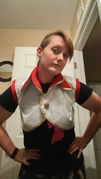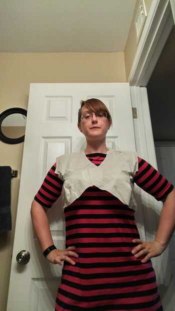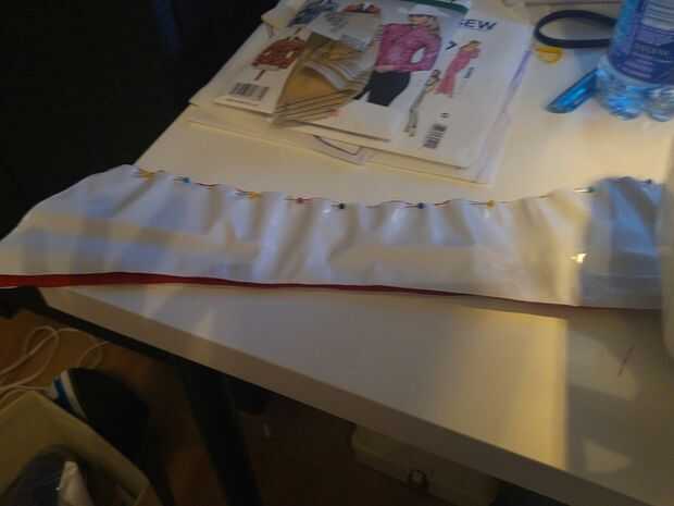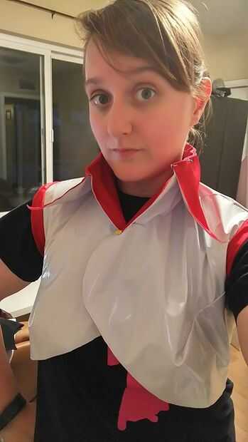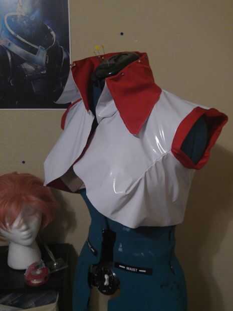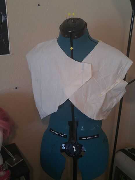 Me cubrió la maqueta juntos y descubrió necesitaba más largo en los lados, menos en la parte delantera y tenía que tomar más. Después de unos accesorios que pude conseguir el look adecuado. De allí cortar el entretela/forro (rojo porque sería dar la vuelta el cuello y los brazos tienen "mangas" imitación"que son de color rojo) luego usé la entretela para cortar la tela externa (hacer esto en el caso de mis cortes son sucios). He cosido el forro a la tela externa entonces cubrió y había probado el ajuste una vez más.