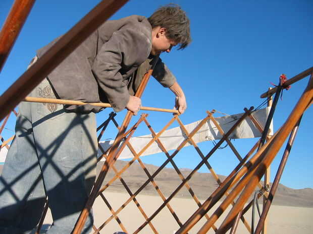 13. halter. Tiro algunas cuerdas sobre la tapa para mantener unida a toda la cosa y evitar que sopla lejos. Si eres un Mongol observador usará pesos en lugar de clavijas para No apuñalar a la madre tierra.
