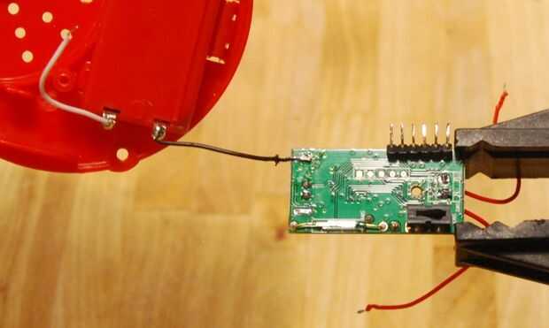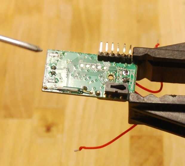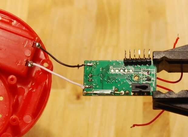 Retiramos los dos terminales de la placa de circuito, así que ahora tenemos un lugar para conectar estos cables. No es un agujero estándar, por lo que me pareció más fácil soldar los cables directamente a la superficie de la Junta.