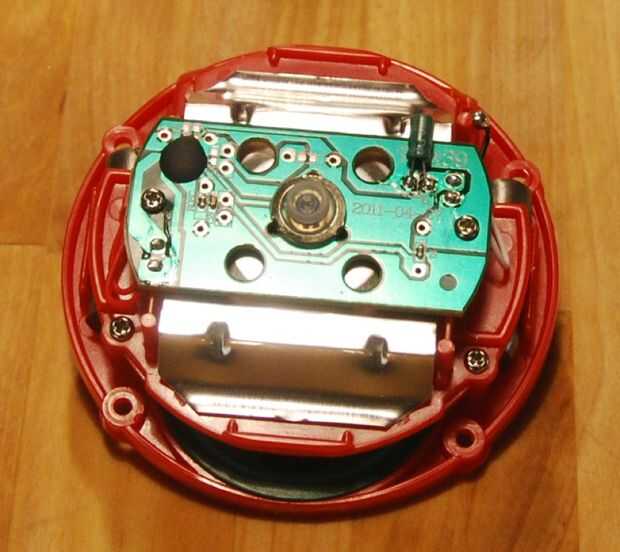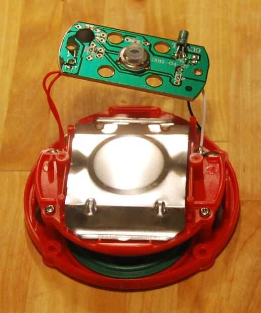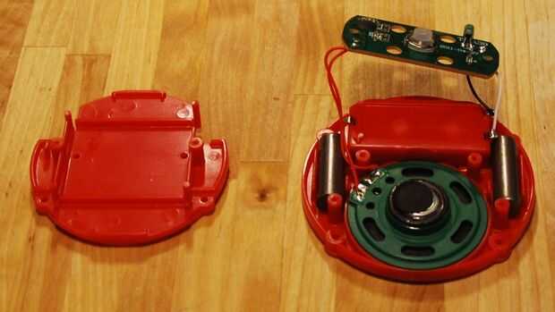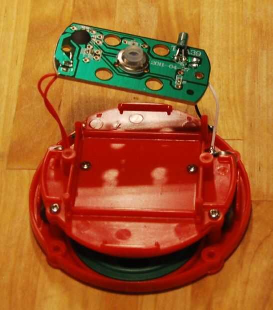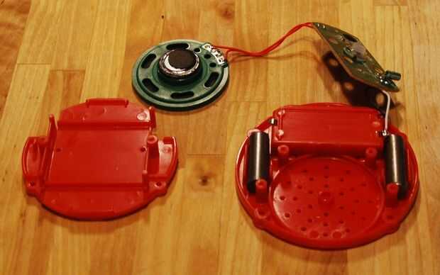 El clicker levanta derecho a exponer dos tornillos más. Retire los dos tornillos y los otros dos sujetando el soporte plástico. Entonces usted puede levantar el Monte y verás el altavoz y los dos pesos poniendo en su lugar en la base del botón. Puede extraer el altavoz de su casa.