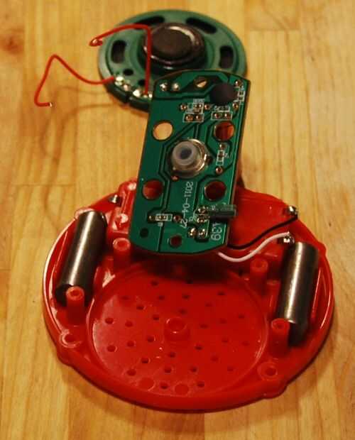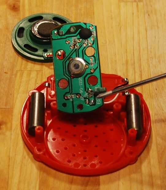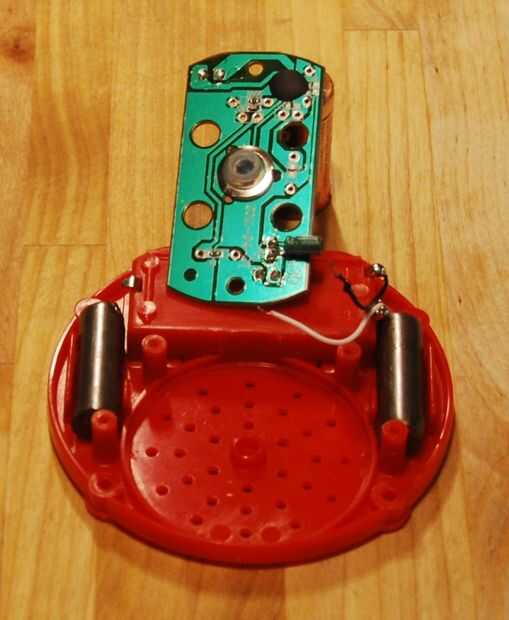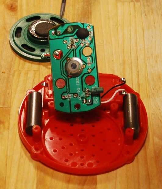 La placa de circuito tiene un interruptor ingenioso que se alinea perfectamente con el botón cuando está atornillada en su lugar. Lo reutilización de nos ahorra mucho trasteo para crear uno de los nuestros. También hay cuatro cables conectados a él, que son exactamente el número de cables que va necesitando para este proyecto. Si se puede salvar, es como 5¢ ahorrado!