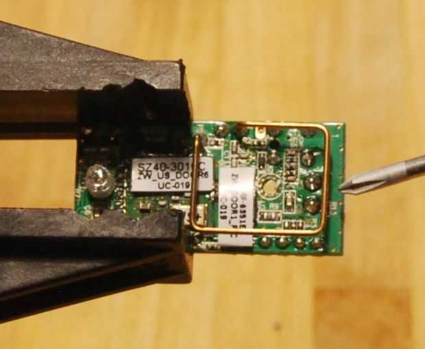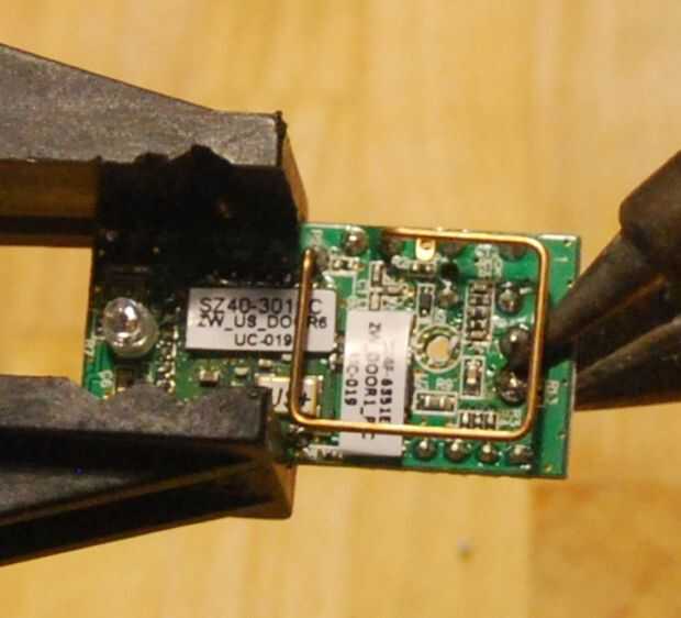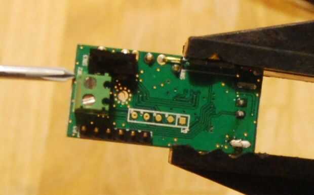 Especie de puedes el tornillo de terminal, como lo indica mi práctico dispositivo señalador. En el reverso, puedes ver los dos empalmes de la soldadura cuidadosamente vigilados por la antena del sensor. Queremos desoldar el terminal sin molestar a la antena.