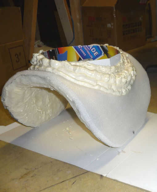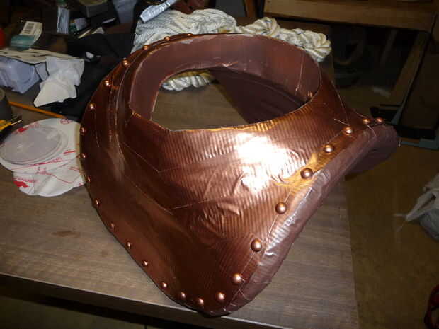 Traté de pintar la espuma y la espuma de poliestireno pero los bordes eran demasiado sensibles, así que cubrí primero la parte entera de la cinta del conducto. He añadido tachuelas de alfombras de textura un poco luego pintado la parte superior con pintura de cobre y la parte inferior con pintura color piel.
