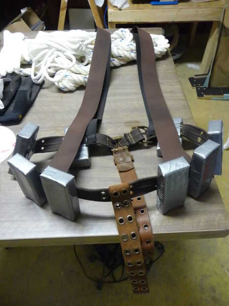 Las correas se reunieron simplemente mediante el uso de las hebillas y unas bridas. Ataduras de cables también unen los tirantes elásticos (ahora pintados marrón) a la correa.