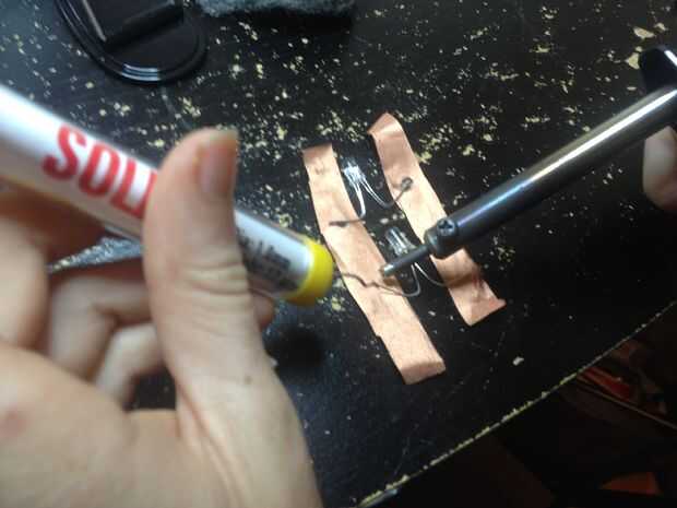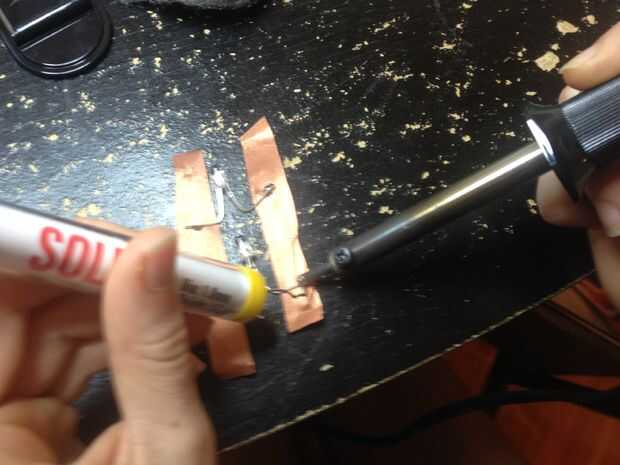 Usé soldador y tela conductora porque tenía ésos práctico, pero puede utilizar la cinta de cobre y empuje las piernas llevadas firmemente hacia abajo. Recordar que el + piernas positivo deberían ser sobre una tira y las patas negativas (-) deben estar en el otro.