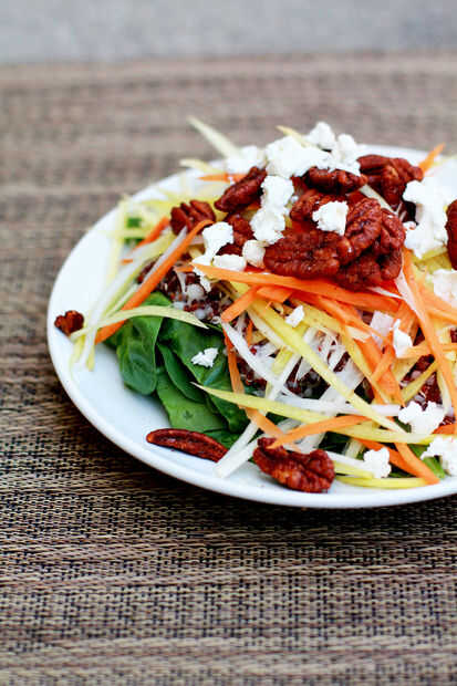 Zanahorias ralladas junto con queso de cabra y nueces para una ensalada muy otoñal. Cuscús israelí y quinoa roja hacen de esta ensalada abundante y bueno para un almuerzo o cena. Para los no vegetarianos, la adición de camarón o pollo transformaría esta ensalada en una comida completa. He encontrado herencia tri-color zanahoria en Trader Joe; Si tienes un local comerciante Joe en su área, usted también puede encontrar estas zanahorias de herencia para tu ensalada. Nueces confitadas se compran simplemente de una bolsa en Trader Joe, pero usted puede hacer su propia si se siente ambicioso.