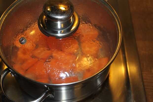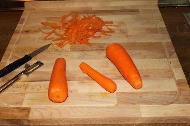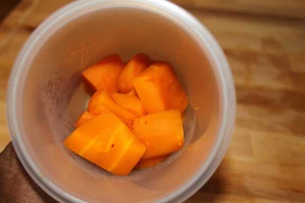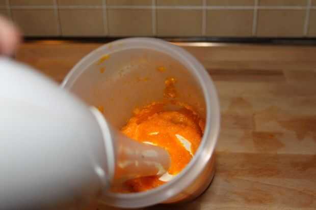 Piel y chopp las zanahorias. Hervirlos bien. Utilizar su batidora de mano y hacer una pasta. Utilice sólo las zanahorias y deseche el agua hervida.