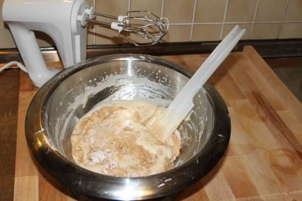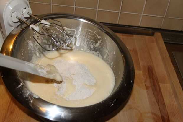 Agregar ahora la mezcla de harina a la mezcla de huevo y mezclar bien.