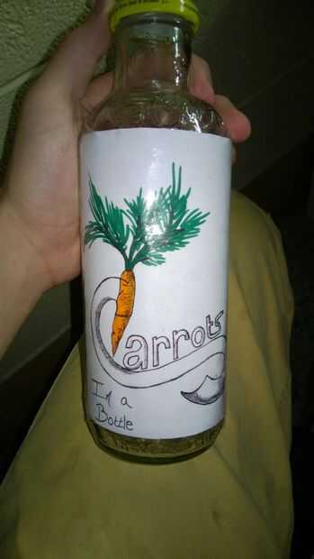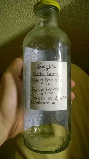 La etiqueta sirve dos propósitos: 1) para exhibir su ingenio en la fabricación de un plantador de maravilloso para zanahorias y 2) para cubrir cualquiera del residuo pegajoso que no podía ser removido durante el lavado. Después de haber creado la etiqueta frontal, cubre toda la etiqueta en la cinta, que haya más caída a que se pueden aplicar a la botella. Cubriendo en cinta hace la etiqueta sobre todo impermeable. Como ves en mis fotos Retire la cinta sobrante con tijeras o cuchillo para que tenga una línea recta de la cinta. Coloque la etiqueta del frente en botella cubriendo la mayor cantidad de área pegajosa que tienes. Si lo desea puede hacer lo que hice y crear una etiqueta posterior, similar a las etiquetas nutricionales en la parte posterior de los productos. En la mía he incluido la información sobre el paquete de semillas. Como con la etiqueta del frente me cubrió la contraetiqueta con la cinta y cortar el exceso. Si usted nota, hice mis datos para que la fecha de germinación se podría escribir en su más fácil escribir sobre papel en vez de cinta para no poner cualquier cinta en este campo en blanco. Se aplica a la botella.
