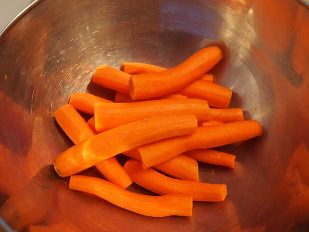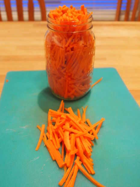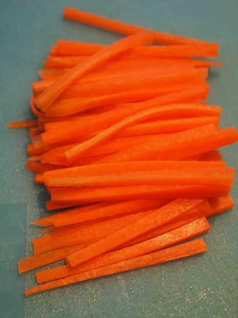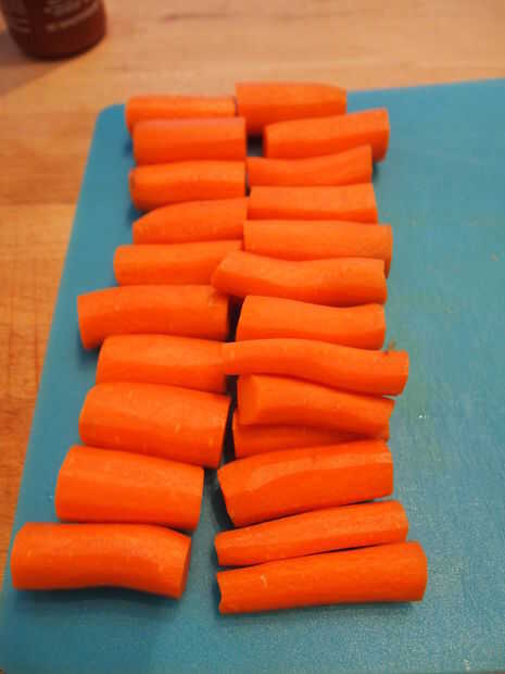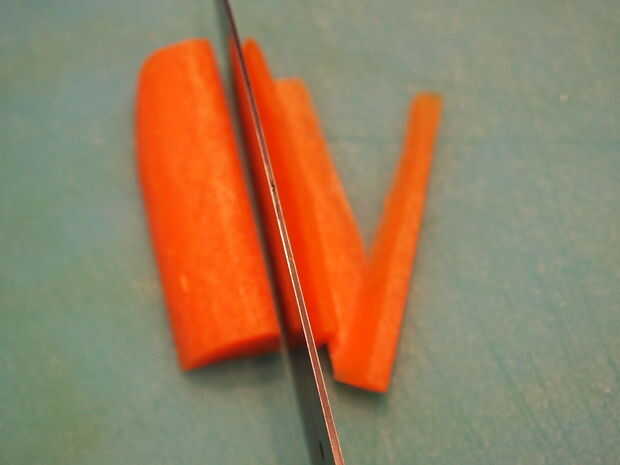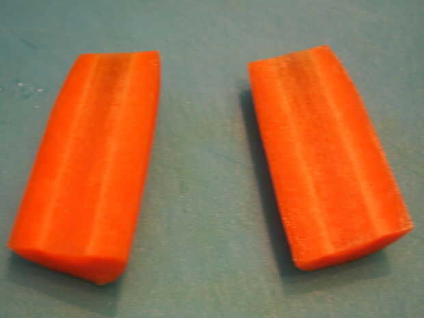 Luego cortar las zanahorias en trozos iguales, que para alrededor de 1.5"- 2" y busca un palo de fósforo de gran tamaño. Esto podría ser mucho más rápido si tienes una mandolina, de lo contrario solo cortarlas lo mejor pueda a mano.