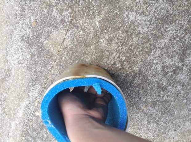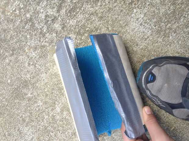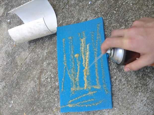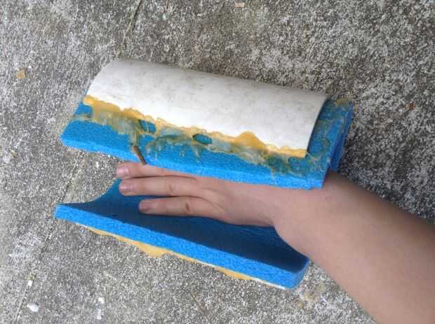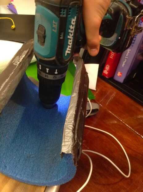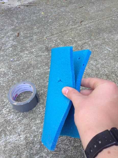 Utilice pegamento spray y cubrir un lado de la espuma. Doblar por la mitad y mecharla (con cuidado) en el tubo de PVC. Utilice cinta adhesiva para cubrir cualquier exceso de pegamento. Después de eso, atorníllelo en su lugar con tres tornillos de drywall de 1 pulgada.