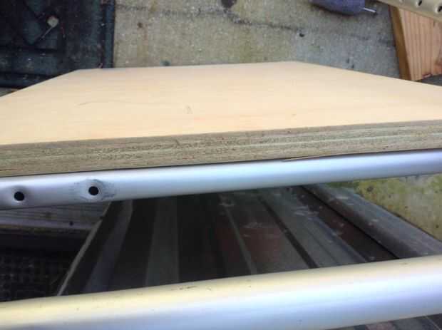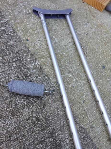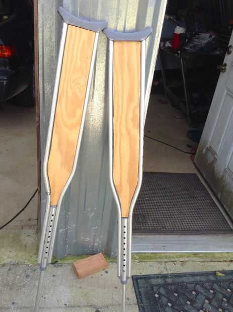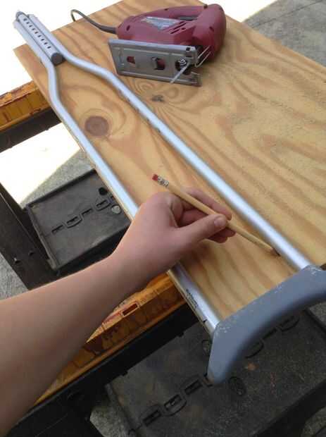 Conseguir algunos de esa madera (Asegúrese de que se trata del mismo espesor que el tubo) y después de retirar la manija, trazar y cortar la sección central de las muletas. Puede utilizar su primer recorte a su otro. De esta manera tendremos una base para los cojines del pie!