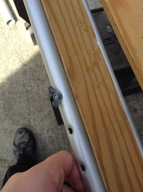 Perfore un agujero a través de la madera con el agujero superior las muletas como guía. Entonces, puede utilizar el hardware de las manijas en el orificio superior para asegurar la madera en el lugar.