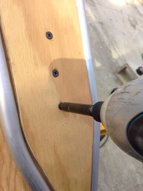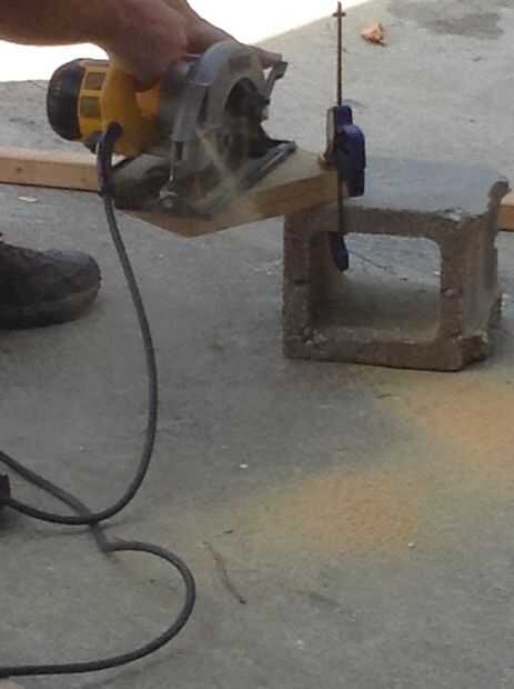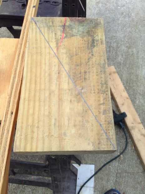 Cortar de esquina a esquina en dos por seis (aproximadamente 10 pulgadas de largo) y atorníllelo en la sección central de las muletas asegurándose de que quede centrado, descansando sobre la abrazadera que hicimos anteriormente. Utilice al menos tres tornillos de 3 pulgadas para mantener en su lugar.