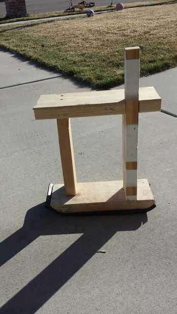 Corte el 2x4s a la longitud correcta y atornillarlas. Tipo de puede ver en la foto cómo muesca en la parte posterior para la ayuda de la pierna. Asegúrese de que estos se encuentran en el mismo lugar en cada zanco.