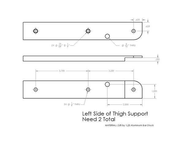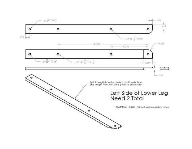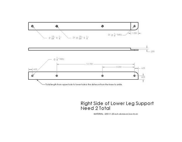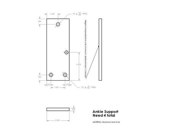 La tobillera se hace de 1/4 de pulgada por acción de la barra de aluminio de 2 pulgadas. Se necesita 4 de estos. Hay solamente un dibujo ya que los 4 son los mismos. Los agujeros se perforan como se muestra con no más de perforación necesarios. La longitud total de la pieza dependerá de la altura de la articulación del tobillo medida que anteriormente además de 1.5 pulgadas. Vea el dibujo de los detalles.