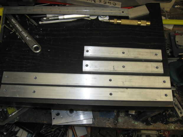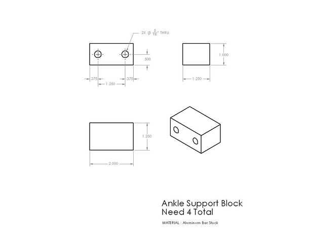Se necesita hacer 4 bloques de soporte de la acción de la barra de aluminio de 1 por 2 pulgadas. Estos son todos iguales y necesitan tener 2 agujeros perforados como se muestra en los dibujos. Es fundamental tener los agujeros directamente ya que afectan a la alineación y dificultan la Asamblea si no están. Otra vez se refieren a los dibujos de dimensiones exactas. Estos bloques de controlan el ancho de la tobillera y no tendrá que ajustarse todo más pequeño. Si tienes tobillos amplia puede que necesite hacer los bloques un poco más amplias en la misma dirección que los orificios perforados. Vea el dibujo de los detalles.