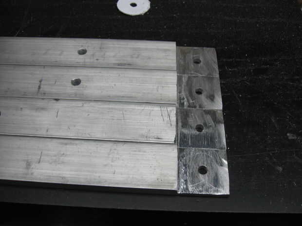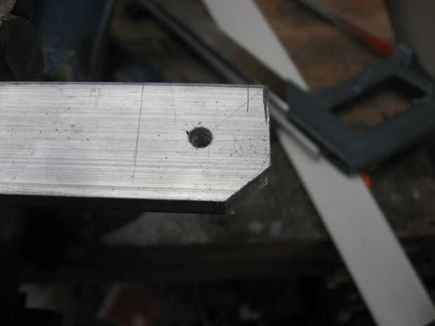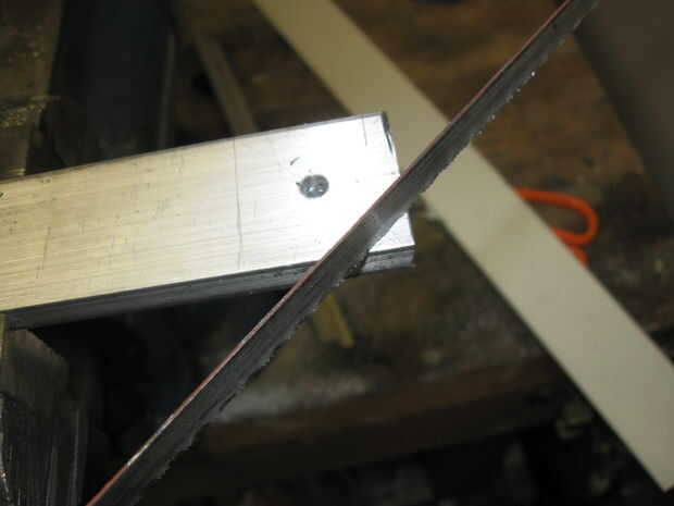 Articulación de la rodilla es creada por algunos de aluminio cortando con una sierra para metales. Puedes superponga el material y no recortar pero esto puede crear punto frotante en la rodilla. El corte método coloca el centro de la articulación en el centro del material.