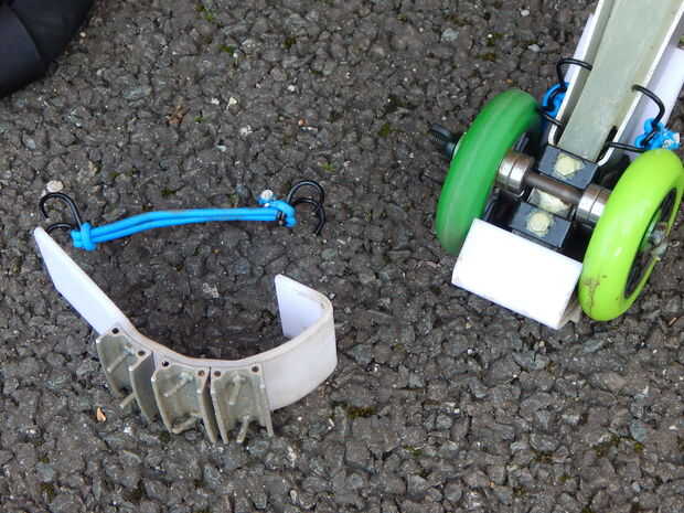 Me ha pasado algunas pequeñas cuerdas elásticas y como puede ver el ajuste un tratamiento en el marco, ir alrededor de la parte posterior de la pisada y en el otro lado de la cerradura - estoy adivinando puede conseguir en EBay o incluso hacer tu propia.