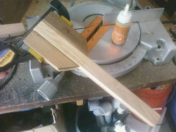 Tenemos que hacer un descanso apoyo para la placa base. Yo llevo piezas de la madera 1 "X 1" y él cortó cinco pulgadas largo con un ángulo sólo para las miradas. Cuatro de ellos, dos para cada pierna. Pegarlos a los lados con pegamento del gorila y sujeta firmemente.