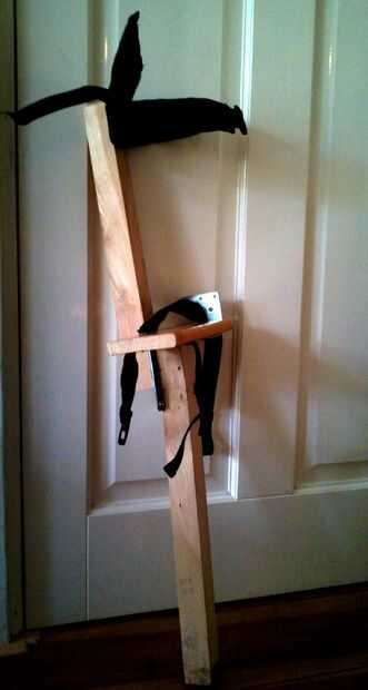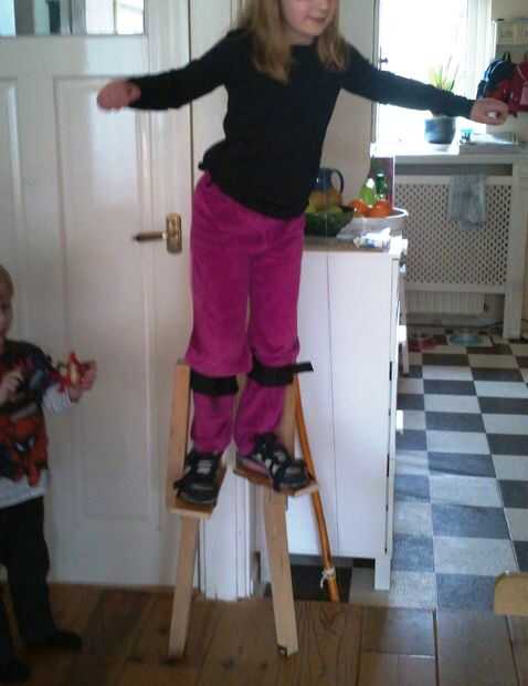 - Los que se ven que mi hija lleva se hacen de las piernas de una vieja silla de madera de haya, pero boca abajo. Haciendo así que creado apuntando un poco hacia delante para que el punto de equilibrio es mas bajo los pies, que hace más fácil caminar sobre zancos.