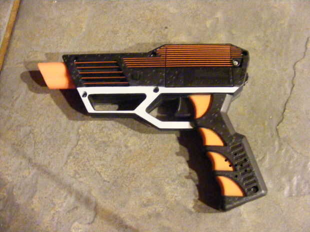 Elegí dos pistolas láser de ToysRUs. Dos armas de fuego vienen en una caja, y se llaman aire zona Lazer Tag. Si vas a usar otra marca, recuerde que el arma es también el objetivo. ¿Tenemos esa característica, por lo que el Drone puede disparar hacia nosotros con el mismo módulo que la etiqueta, tiene sentido? Hemos decidido no utilizar el a bordo de la batería de los aviones no tripulados al poder el módulo láser, utilizamos un paquete de baterías separado. El a bordo de la batería tiene suficiente problemas operando el buque.