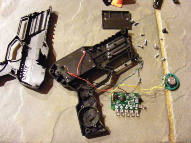 Un arma sigue siendo sin modificar, sólo carga las baterías AAA (3) en el compartimiento y dejar a un lado. Eso fue fácil. Ahora retire los siete tornillos del lado izquierdo de la pistola de segunda, y viene aparte. Ningún plástico fusión, ningunos alambres para cortar. 3 tornillos dentro y el circuito es gratis. Hicimos un soldadura los cables a la caja de la batería, así nos podríamos separar los componentes como se ve en el cuadro 3. Es probablemente posible hacerlo sin ese paso, pero la soldadura si se puede. Muchas de estas armas son difíciles de conseguir aparte y tienes que cortar y perforar el plástico para sacarlos aparte. Esta pistola es una buena opción, ya que hace una estructura cuidada, con poco esfuerzo o barbarie. Nos ocuparemos con el cuadro 4 más adelante, si queremos cortar la corriente a nuestro robot después de que ha sufrido 6 veces, tendremos que soldar los cables a la placa.