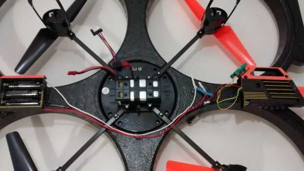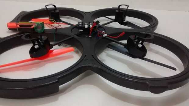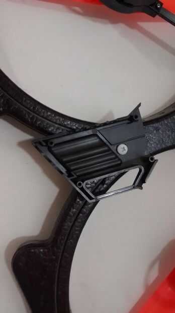 Desmontar el módulo de pistola pequeño otra vez, lo siento, pero tenía que todo lo trabajado todavía asegurarse de que. Usé un udir/c Super OVNI U829 para mi Drone. Es lo suficientemente grande y suficientemente robusto como para llevar este paquete de módulo y batería. Y tiene un botón de foto fija en el transmisor (no estamos utilizando ahora porque no tenemos una cámara montada), por lo que planea usar ese botón para disparar nuestro "cañón láser".
