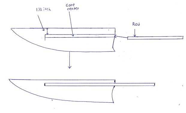 Paso 5-medida 1 1/2 pulgada se ahogan de la parte plana de la espada y poner la varilla de pasador en los 2 matts. medir hasta qué punto desea que la barra para ser el centro de su núcleo. Tenga en cuenta que deben permanecer 3 a 4 pulgadas de la punta de lo que será tu espada cuando todo termine. A continuación trace con un marcador negro la forma de la barra. también trazar una marca en la varilla de cuánto pasó a ser el centro del núcleo
