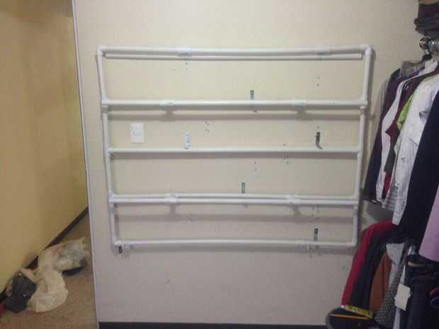 lo colocamos la de en pared en de este caso aumentando L de metal para soporte en las 4 esquinas y en los intermedios del tubo interior para soportaran el peso y no se pandearan o depformaran por el peso de los zapatos
