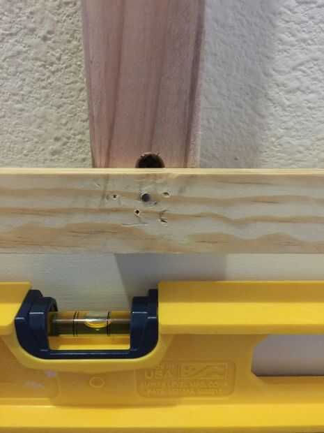 El primer paso es instalar el listón horizontal más bajo. Debe quedar al ras con la parte inferior de los soportes verticales. Acabé consiguiendo tres de 9 pies de largo, de mis listones horizontales, así que la primera fue un poco un truco para línea hasta medir. Pero me pareció mejor medir cada listón en sitio y luego cortar.