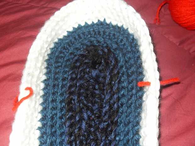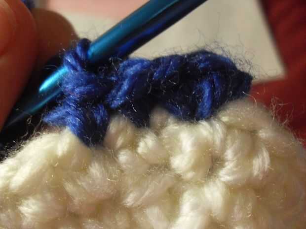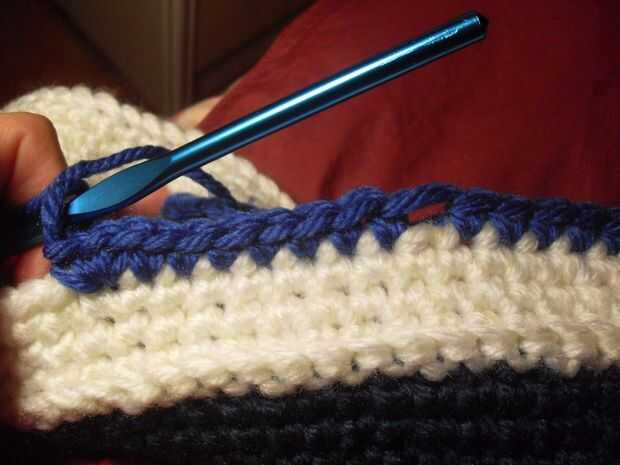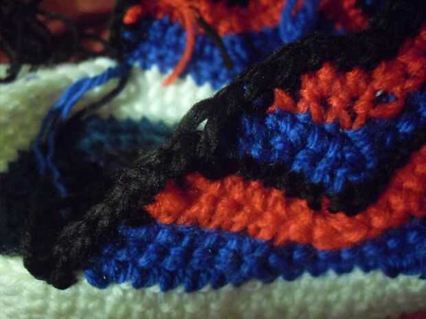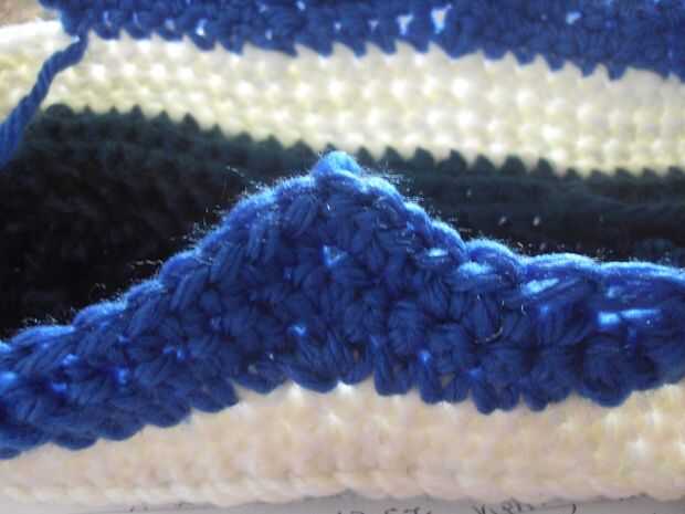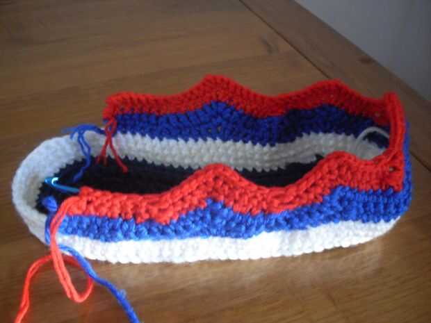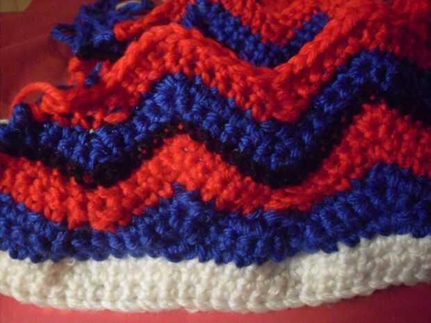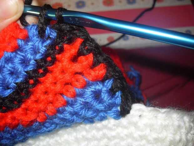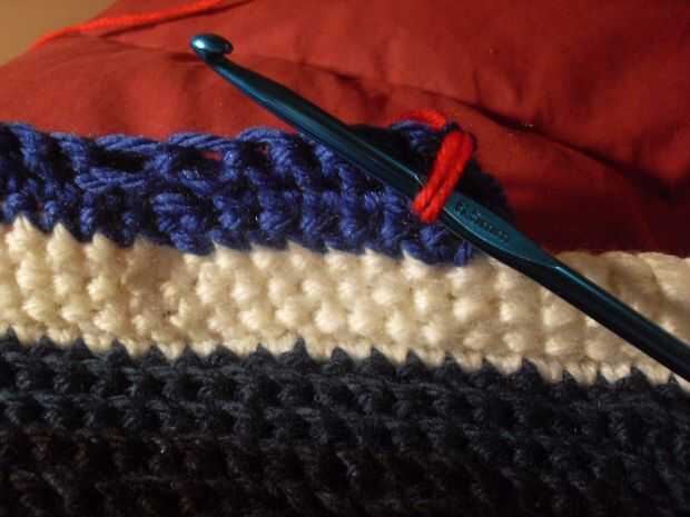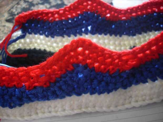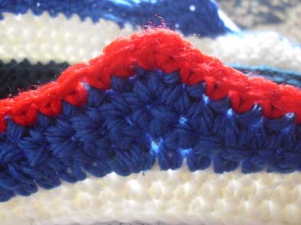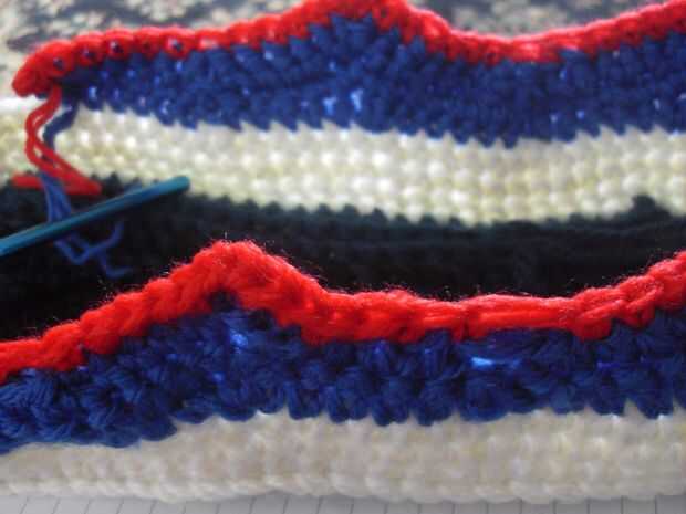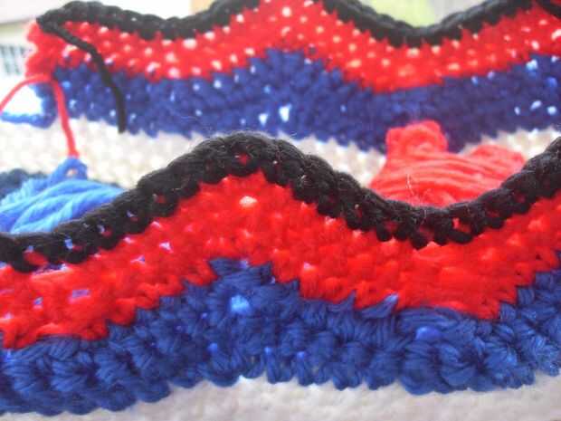 Empecé con el hilo azul al principio e hizo azul de 3 filas de 3 filas de rojo, 1 fila de color negro, 2 filas de azul, 2 filas de rojo, 1 fila de negro.