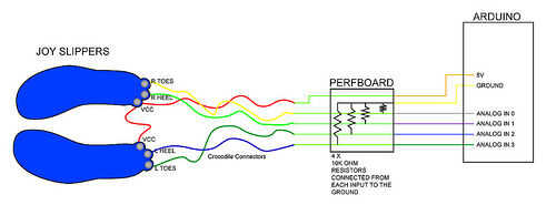 Por supuesto, si usted sabe lo que está haciendo, puede conectar las zapatillas hasta cualquier otro circuito o dispositivo que tiene para hacer uso de la resistencia variable. Así que si no va a enganchar las zapatillas de alegría hasta el Arduino, puede omitir este paso.