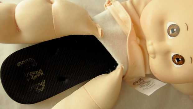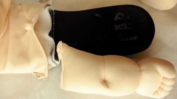 Con el pegamento, colocar las piernas a lo largo de la parte superior de la lana. Con cada pierna, desde la parte exterior de la zapatilla y su forma de trabajo.