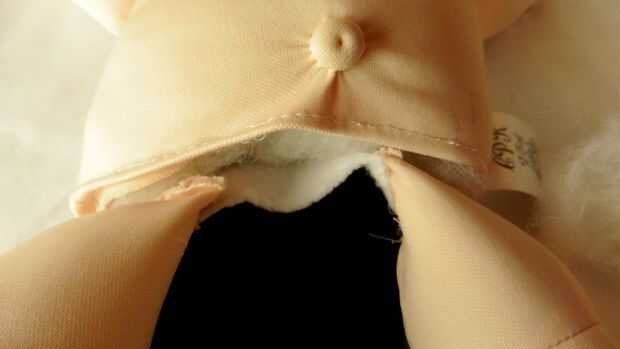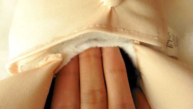 1. Tirar la piel hacia abajo y añadir el relleno hacia el bebé (en el bolsillo entre el forro y la piel).