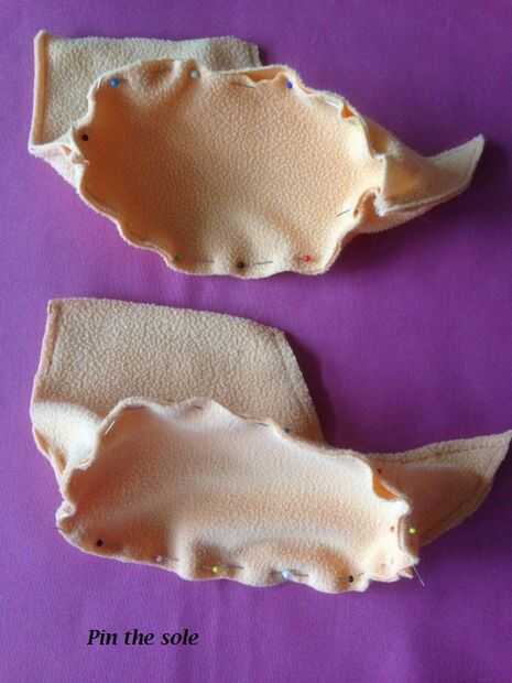Fijar suela a deslizador lados asegurándose de que las costuras delanteras y traseras permanecen centradas en puntera y talón. Se recomienda la fijación en esta etapa, pero no es necesario si usted es bastante valiente y ha medido con precisión. Recuerde mantener a todos en el encarando los derechos.