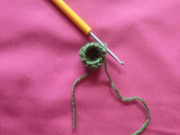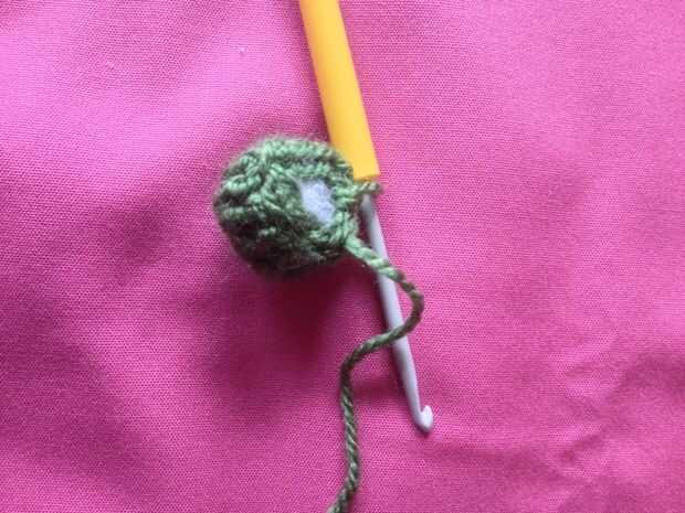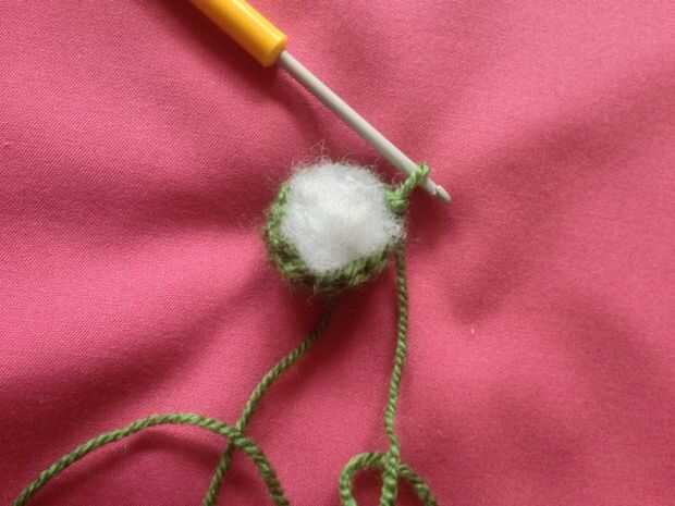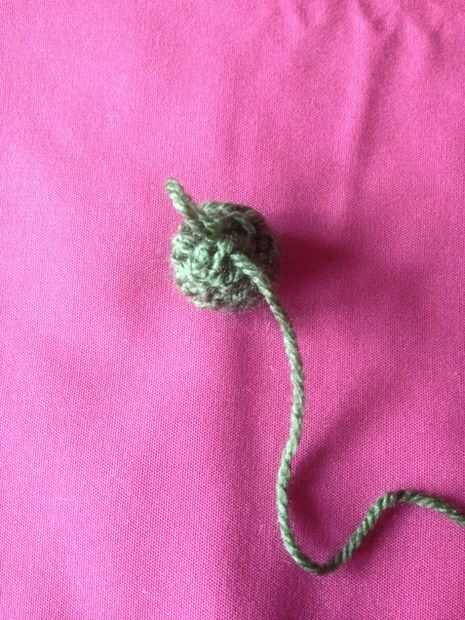 Ganchillo una bola pequeña, rellenar con lana y coser en el punto. Crochet redondos pequeños para los lados. Dos la puntada de cadena y el resto son doble crochet. Cosa las puntadas de manta justo alrededor de la parte inferior y en la parte superior.