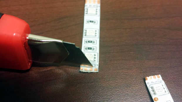 Utilice un cuchillo X-ACTO para cortar la cubierta impermeable de la tira de LED que cubre los puntos de cobre. Tenga cuidado de no cortar la tira del LED. Asegúrese de que usted retire la tira de LED de respaldo.
