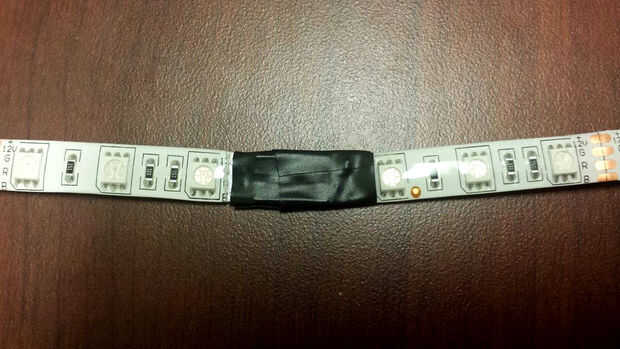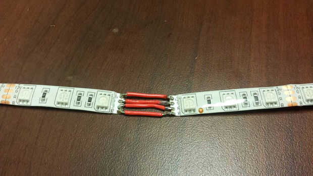 Si eres como yo y tienes tiras de LED de longitud variable ahí que desea utilizar para este proyecto, esta sección es para usted! Vas a tener que soldar las tiras entre sí mediante la conexión de la R, G, B y líneas de energía. Asegúrese de que usted tiene tus franjas orientados correctamente donde R se conecta a R, G conecta a G y así sucesivamente. Si una de las tiras es al revés entonces no funcionará.