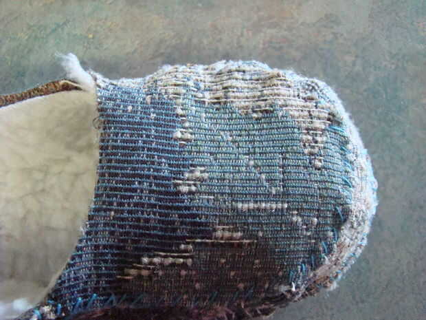 Otra vez usé la puntada del azote, tirando firmemente después de cada puntada para colocar la última pieza a la zapatilla.