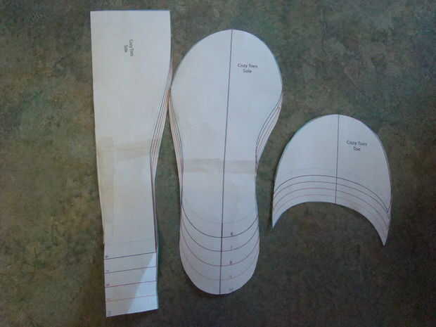 Después de la impresión del patrón, utilizar las tijeras de papel y cortar las piezas.  Coinciden con las líneas de colores y únalos con cinta adhesiva los trozos de los lados y la planta del pie.  Me di cuenta de que no había ningún margen para el patrón.  Por eso elijo un lado que me permita coser las costuras y todavía mis pies.