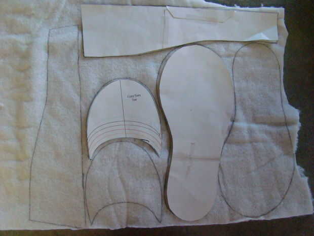 En el lado equivocado de la mucosa, colocar las piezas del patrón y trazar sobre la tela.  Asegúrese de que obtener un pie derecho y pie izquierdo.  Trace 4 de las piezas laterales y otra vez, asegurándose de que traza una derecha y una izquierda para cada pie.   La parte superior del pie también necesita un pie derecho y pie izquierdo.